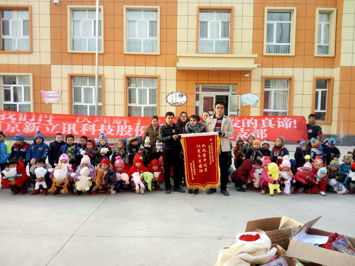 新疆和田市皮縣闊向買里村新建一座幼兒園,地處偏遠,玩具購買不便,幼兒園成立后一直沒有玩具,幼兒午休棉被短缺。新立訊企業對社會公益事業一直秉承著回饋社會、勇于承擔社會責任的宗旨。新立訊企業董事長和高層領導了解該幼兒園情況后,決定以新立訊黨支部的名義進行點對點幫扶。