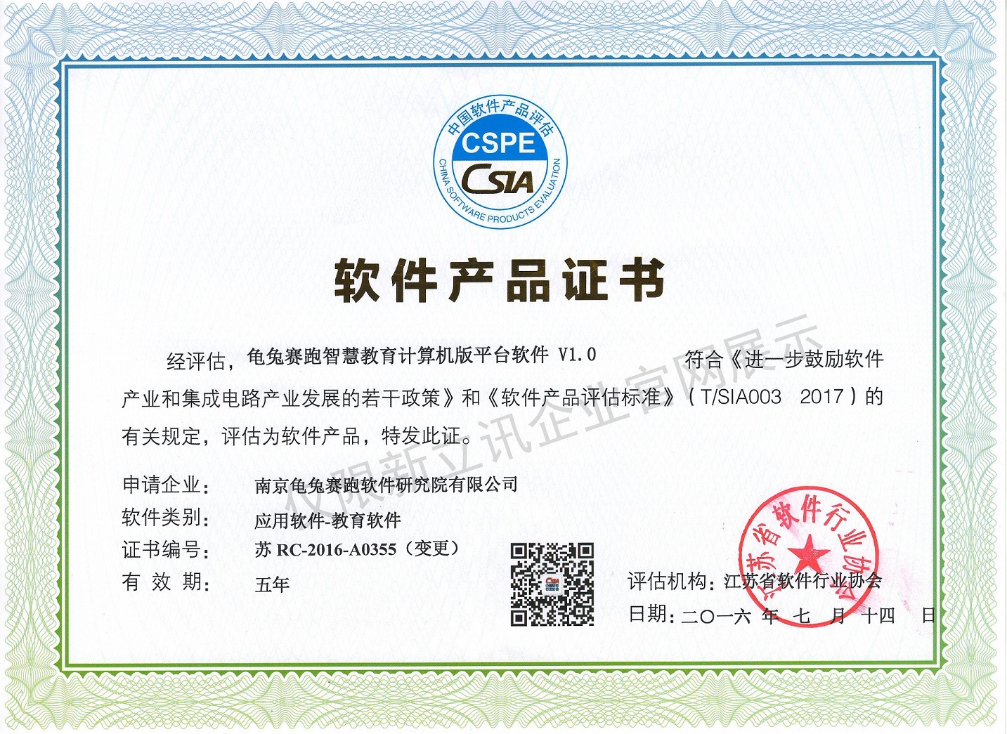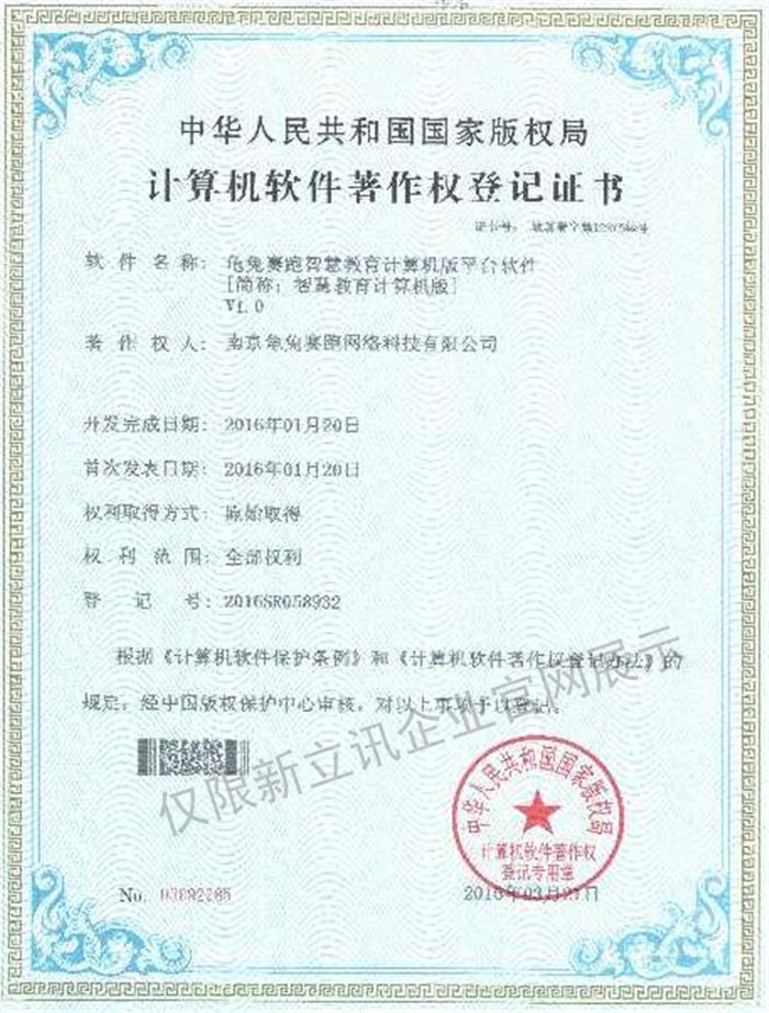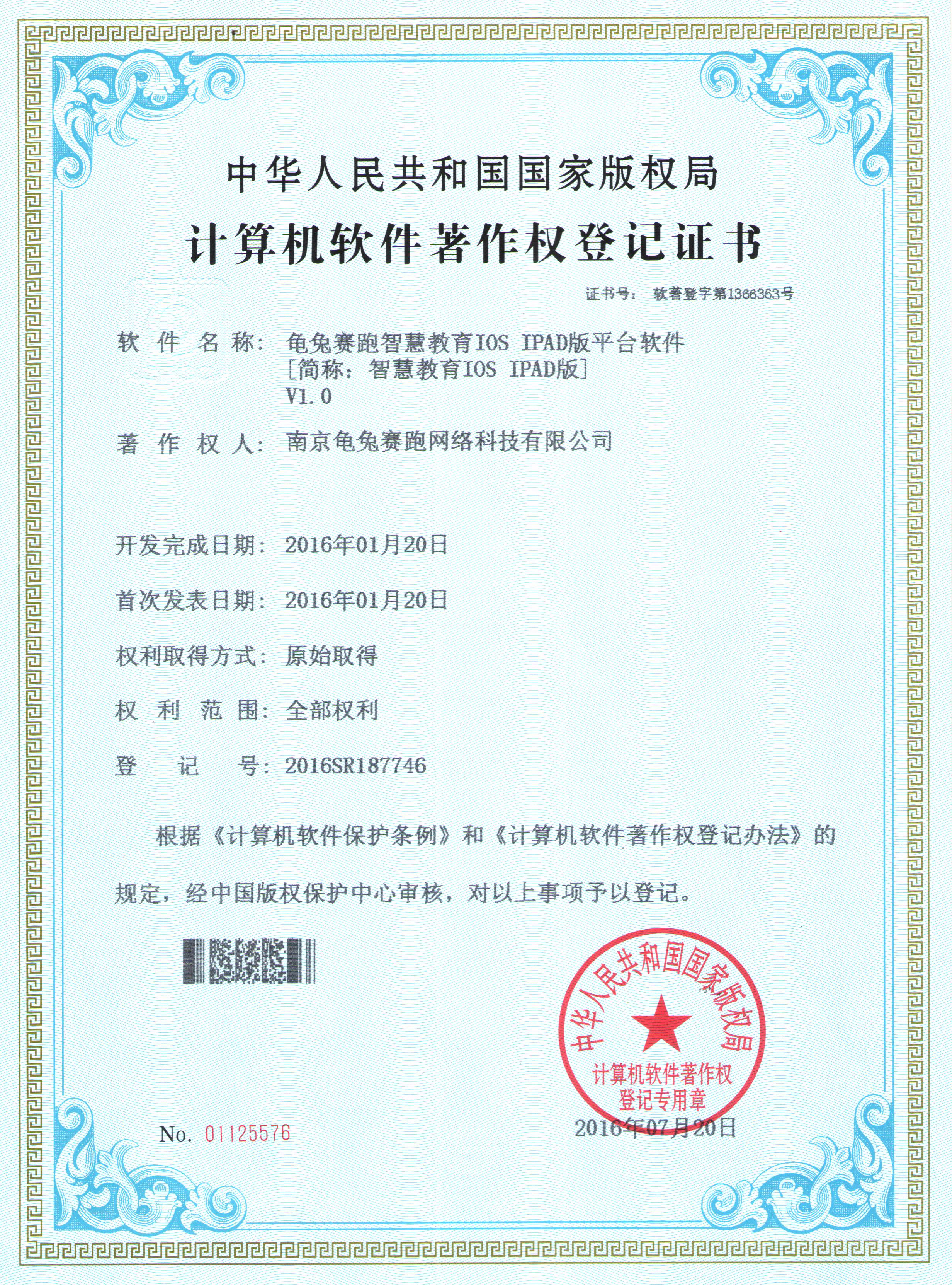 • 2016-07-20龜兔賽跑軟件著作權證書--龜兔賽跑智慧教育計算機版平臺軟件V1.0查看