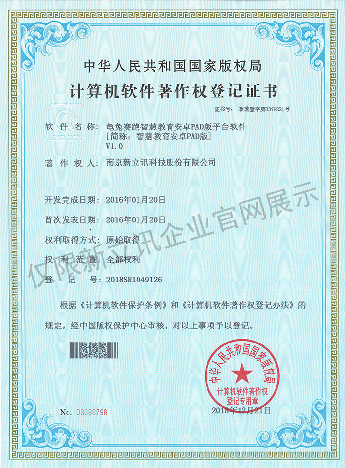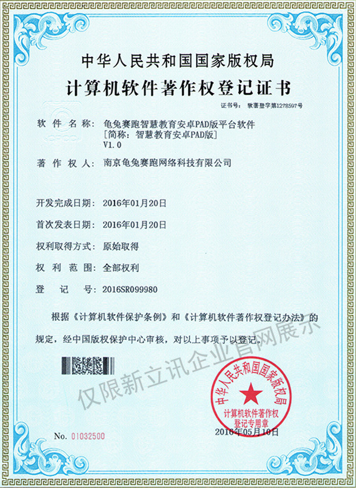 • 2016-07-20龜兔賽跑軟件著作權證書--龜兔賽跑智慧教育安卓PAD版平臺軟件V1.0查看