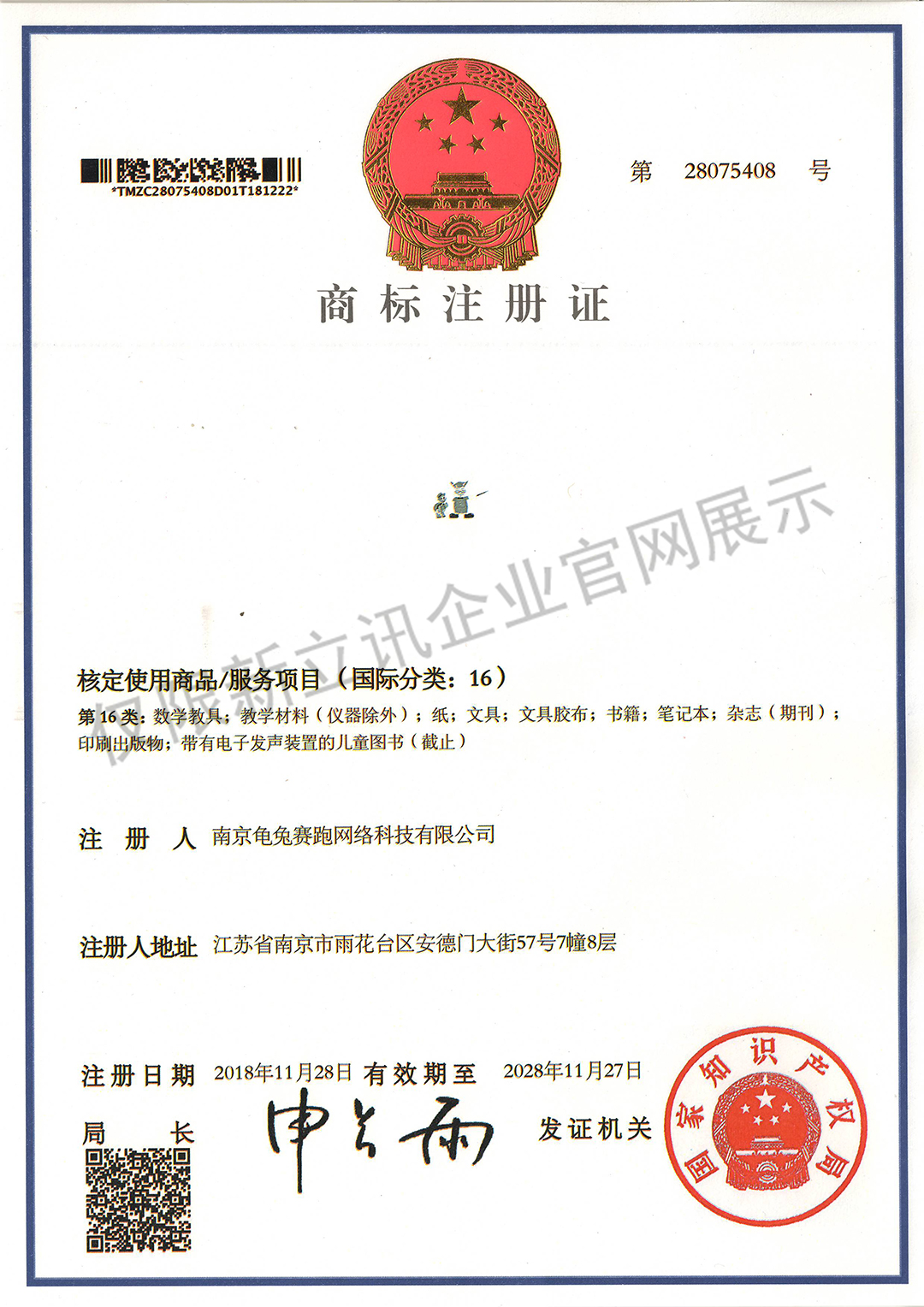 • 2019-11-12龜兔賽跑商標注冊證:第28071792號(國際分類:16類)查看