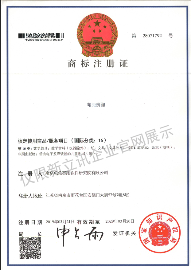 • 2016-07-20龜兔賽跑軟件著作權證書--龜兔賽跑智慧教育安卓手機版平臺軟件V1.0查看