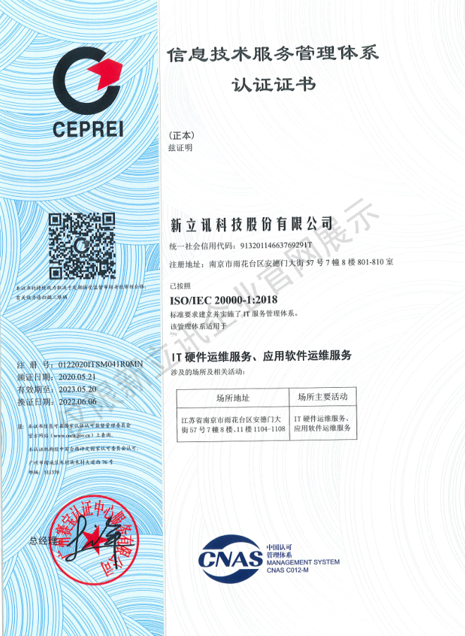 • 2020-12-28新立訊5G物聯網與數據監測云平臺軟件V1.0軟件產品證書查看