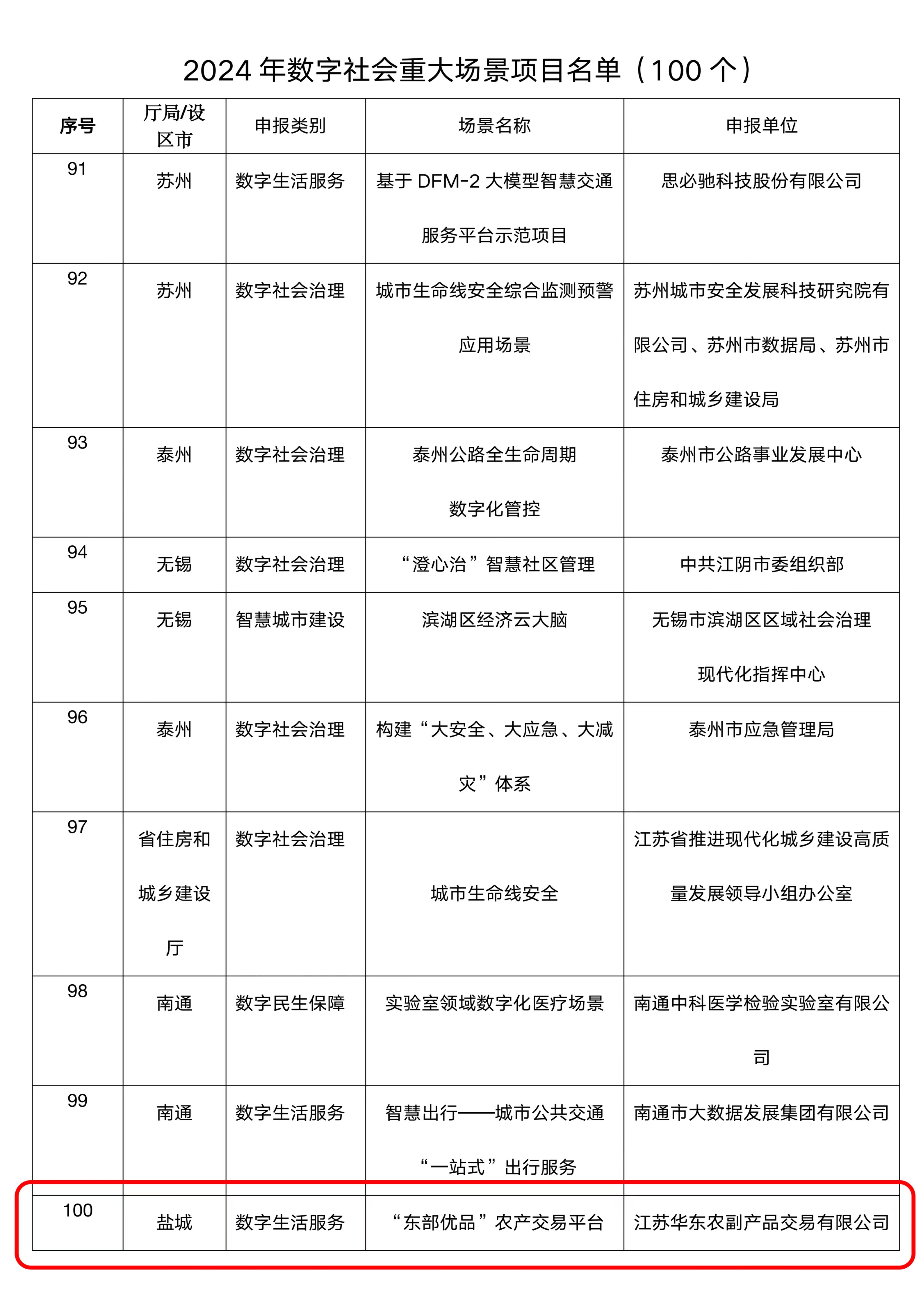 2025年1月17日,江蘇華東農(nóng)副產(chǎn)品交易有限公司(華東農(nóng)產(chǎn)品交易中心)“東部優(yōu)品”農(nóng)產(chǎn)交易平臺成功入選江蘇省數(shù)據(jù)局“2024年江蘇省數(shù)字社會重大場景項目” 為數(shù)字生活服務類場景項目。