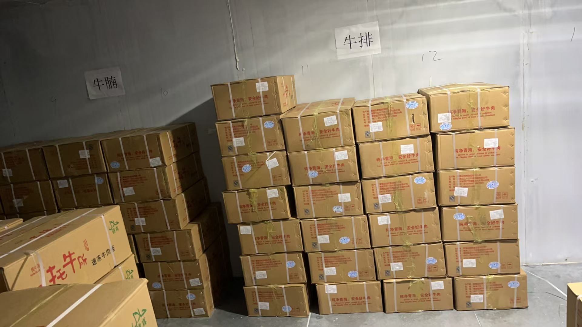 記者隨后來(lái)到位于南京市江寧區(qū)江寧鎮(zhèn)太康路的倉(cāng)庫(kù),里面擺放著一排排整齊堆疊的包裝盒,分類標(biāo)注著牛排、牛腩、牛腱子、羊排等各式產(chǎn)品?,F(xiàn)場(chǎng)打包的聲音很大,幾個(gè)小伙子忙著搬運(yùn)配貨,幾輛貨車正在倉(cāng)庫(kù)外等候。