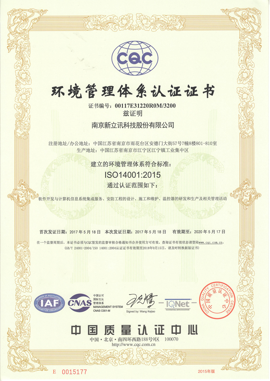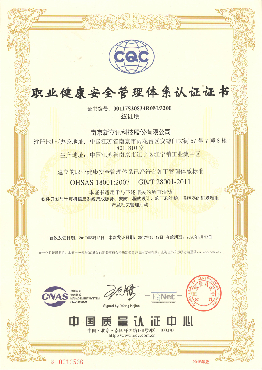 2017年5月,新立訊經(jīng)中國權(quán)威認證機構(gòu)CQC(中國質(zhì)量認證中心)全面、嚴格的評定與審核,正式通過ISO9001國際質(zhì)量管理體系認證、ISO14001國際環(huán)境管理體系認證、OHSAS18001職業(yè)健康安全管理體系認證三大國際管理體系認證,并獲得相關(guān)證書。證書涵蓋范圍包括軟件開發(fā)與計算機信息系統(tǒng)集成服務,安防工程的設計、施工和維護,溫控器的研發(fā)和生產(chǎn)及相關(guān)管理活動。這意味著新立訊成為CNAS(中國合格評定國家認可委員會)、IQNet(國際認證聯(lián)盟)和IAF(國際認可論壇)三方共同認可的綜合數(shù)據(jù)應用服務商,更標志著新立訊的質(zhì)量管理、環(huán)境管理、健康安全管理等已達到國際先進水平。同時此三項證書的取得是對新立訊企業(yè)管理理念和質(zhì)量管理水平的充分肯定,也為企業(yè)向社會提供優(yōu)質(zhì)的產(chǎn)品和服務提供了強有力的保障。