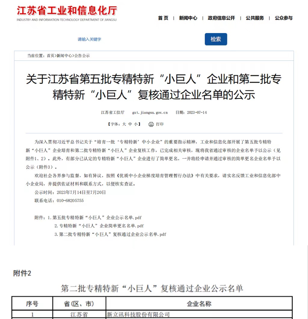 2023年7月20日,新立訊科技股份有限公司“第二批全國(guó)專精特新小巨人企業(yè)”復(fù)核通過,江蘇工信發(fā)布。